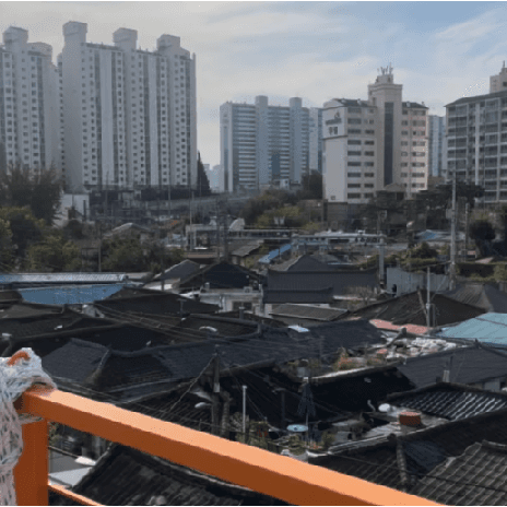 From the rooftop, traditional hanok rooftops meet modern architecture —