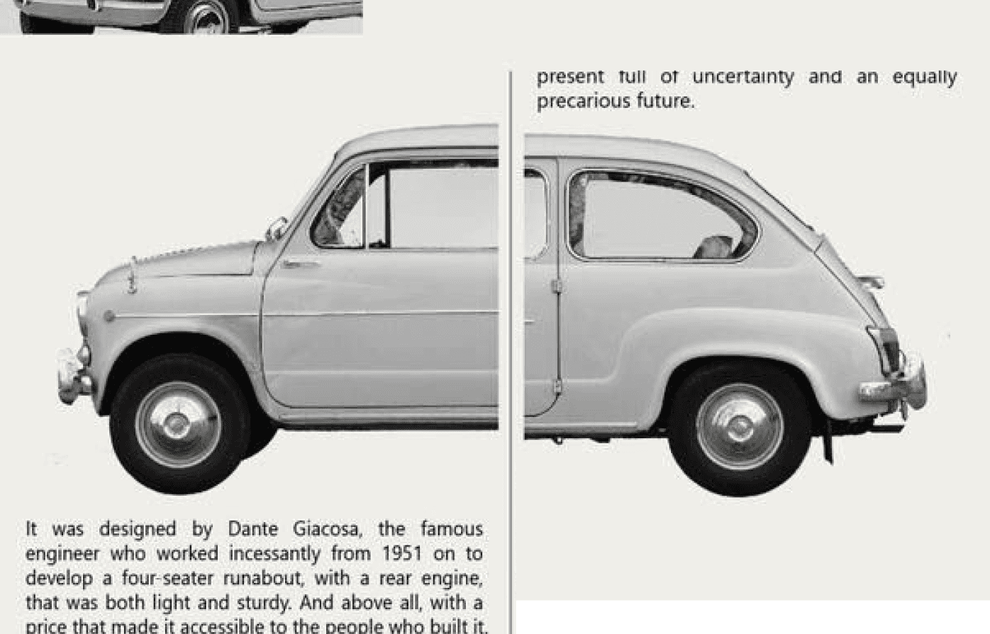 It was designed by Dante Giacosa, the famous engineer who worked incessantly from 1951 on to develop a four-seater runabout, with a rear engine, that was both light and sturdy. And above all, with a price that made it accessible to the people who built it.